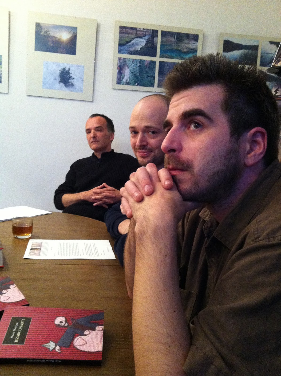 23. travnja, 18 i 10, polazak za Vrbovsko, nas četvoro, četiri Jahača Apokalipse, iliti literalipse, kao što to Zoki reče, s knjigama umjesto pištolja u rukama, jašemo u Twingu put Vrbovskog. Ja i troje Pokojnih, Alen, Zoran i euforični Moris, danas mu je iz tiska došla knjiga, želi da ga zovemo Fjodor Mihailovič, Vrbovsko nas dočekuje u svom najboljem izdanju, grad obljepljen jumbo plakatima s naša četiri lika, sve se doima kao san, još samo jedno kratko piće u kafiću pokraj stadiona, ja bi još jedno da razbijem tremu, ali nema se vremena, Alen požuruje, knjižnica je već otvorila vrata; nailazimo na ravnateljicu, divna cura, zaboravih joj u svoj toj gunguli ime, ulazimo, svjetla se pale, dvorana malena, ali ispunjena do posljednjeg mjesta, na brzinu određujemo redosljed čitanja, ja ću prvi, tako je odlučeno, ja sam taj koji mora razbiti led, sjedamo za stol, u publici euforija, nestrpljenje u zraku, ravnateljica nas predstavlja, moj je red, knedla u grlu, čitam drhtavim glasom, ali nemam razloga za to, publika je oduševljena, pljesak, čitam još jednu priču, pitanja pljušte sa svih strana, mi i publika postajemo jedno, atmosfera prisnosti, eto, sad je već i Zoki na redu, predstavlja svoju novu priču, odlična je, svi se slažemo, u stopu ga slijedi Moris, razgaljuje srca prisutnih dama svojom ljubavnom lirikom i poslije njega, jedan i neponovljivi. šlag na kraju, Alen, njegova je priča urbana, brza, sjetna, publika hoće još – BIS! BIS! – tko bi odolio takvoj publici, Alen čita Morisovu pjesmu o križaljkama, ljudi moja, to je kruna večeri, zahvaljujemo se, polako ustajemo, prebacujemo se u susjednu prostoriju, o kako su to ljubazni ljudi, pa oni su za nas četvoro gladnih i žednih jahača litaralipse pripremili i okrepljenje, ima tu narezaka, vina, rakije kojoj se ne sjećam imena, neka kombinacija tri slova, borovnica, kupina, i još poneka biljka, prozvasmo je BKG u spomen na literarni časopis, nastavljamo razgovor, planovi o ponovnom gostovanju, prodaje se poneka knjiga, a neka bogami i poklanja, ali gdje nećeš nekom tko te tako ugosti nešto i pokloniti, još poneka čašica, čini li se to meni ili je već sve pomalo u magli, a ne, nije magla, možda samo malo previše BKG-a, druženje se nastavlja, još poneki kompliment, gle, ni osvrnuli se nismo već je prošlo jedanaest sati, vrijeme je za povratak, još jedna putna i cigareta pod zvijezdama, nebo je čisto, mjesec pun, cure iz knjižnice nam mašu, valja nam krenuti, put je dug, Vrbovsko ostaje za nama, valja nam proći tamnom pustinjom prepunom opasnosti prema Rijeci. Jašimo u tišini. Sretni.Da je točno tako bilo potvrđuje i foto dokumentacija: